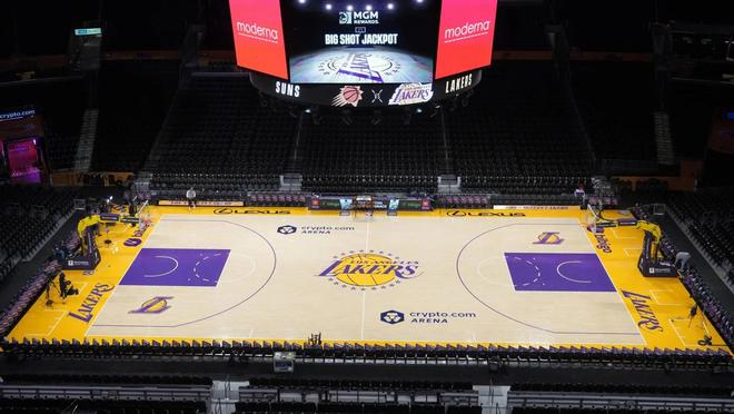 据记者Dave Mcmenamin晒出的照片,湖人队今日将主场装扮进行了翻新,采用了“城市版”的地板装扮,整体的色调更多采用了紫色。而此前湖人主场的常规装扮是以黄色为主。